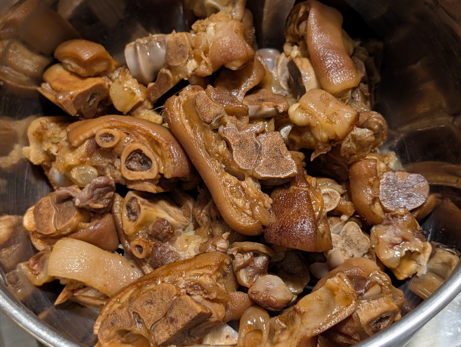 Add pig’s feet, ginger, scallion, (2) dried chili peppers, (2) bay leaves, (3) star anise, and (1) stick cinnamon